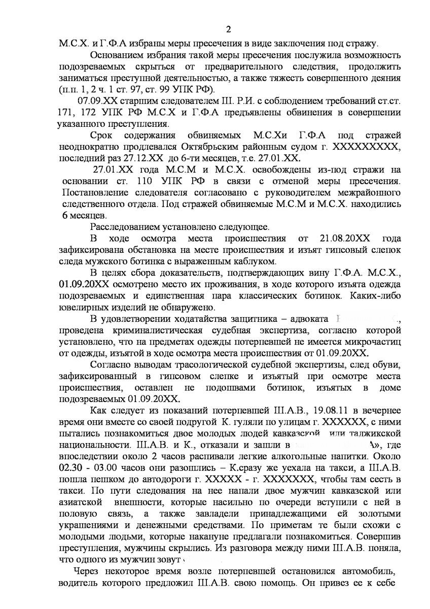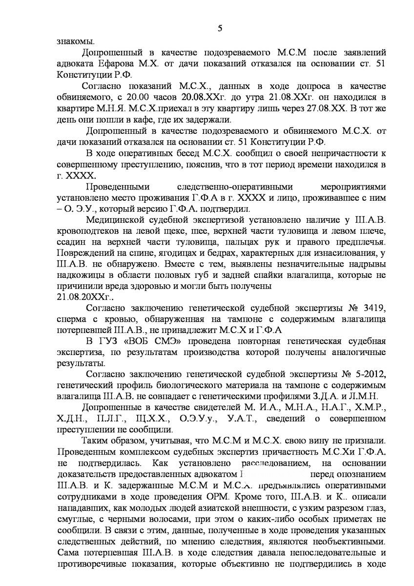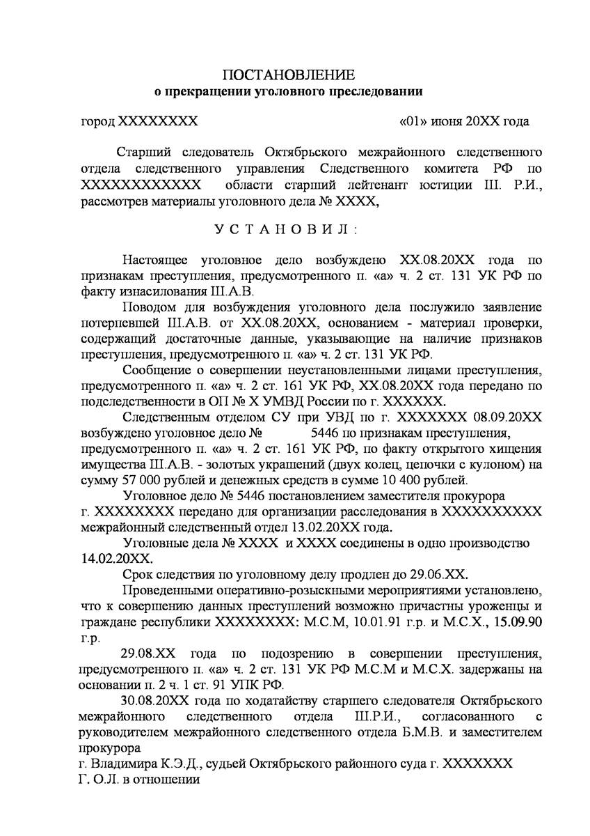 Адвокат в Долгопрудном добился прекращения уголовного дела на стадии предварительного расследования по реабилитирующим основаниям в отношении двух граждан иностранного государства обвиняемых органами предварительно следствия в совершении преступления предусмотренного п. «а» ч.2 ст.131 УК РФ (изнасилование совершенное группой лиц) и п."а" , п."г" ч.2 ст.161 УК РФ (грабёж), наказание за которое предусматривает лишение свободы от восьми до пятнадцати лет, то есть преступление, которое в соответствии с ч.5 ст.15 Уголовного Кодекса Российской Федерации отнесено к категории особо тяжких преступлений.